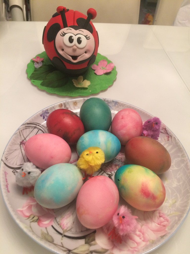 Αφού λοιπόν σιγοβράσεις τα αβγά για περίπου 30-40 λεπτά μέσα σε κατσαρόλα με νερό & αλάτι, ετοιμάζεις ποτηράκια (μιας χρήσης καλύτερα) με χλιαρό νερό και 1 κουταλιά της σούπας άσπρο ξύδι στο καθένα. Προσθέτεις το χρώμα ζαχαροπλαστικής σε κάθε ποτηράκι και ανακατεύεις καλά. Βάζεις μετά το αβγό και καλό είναι να το αφήσεις μέσα στο χρώμα για τουλάχιστον 5-7 λεπτά (εγώ τα αφήνω δεκάλεπτο σίγουρα).
