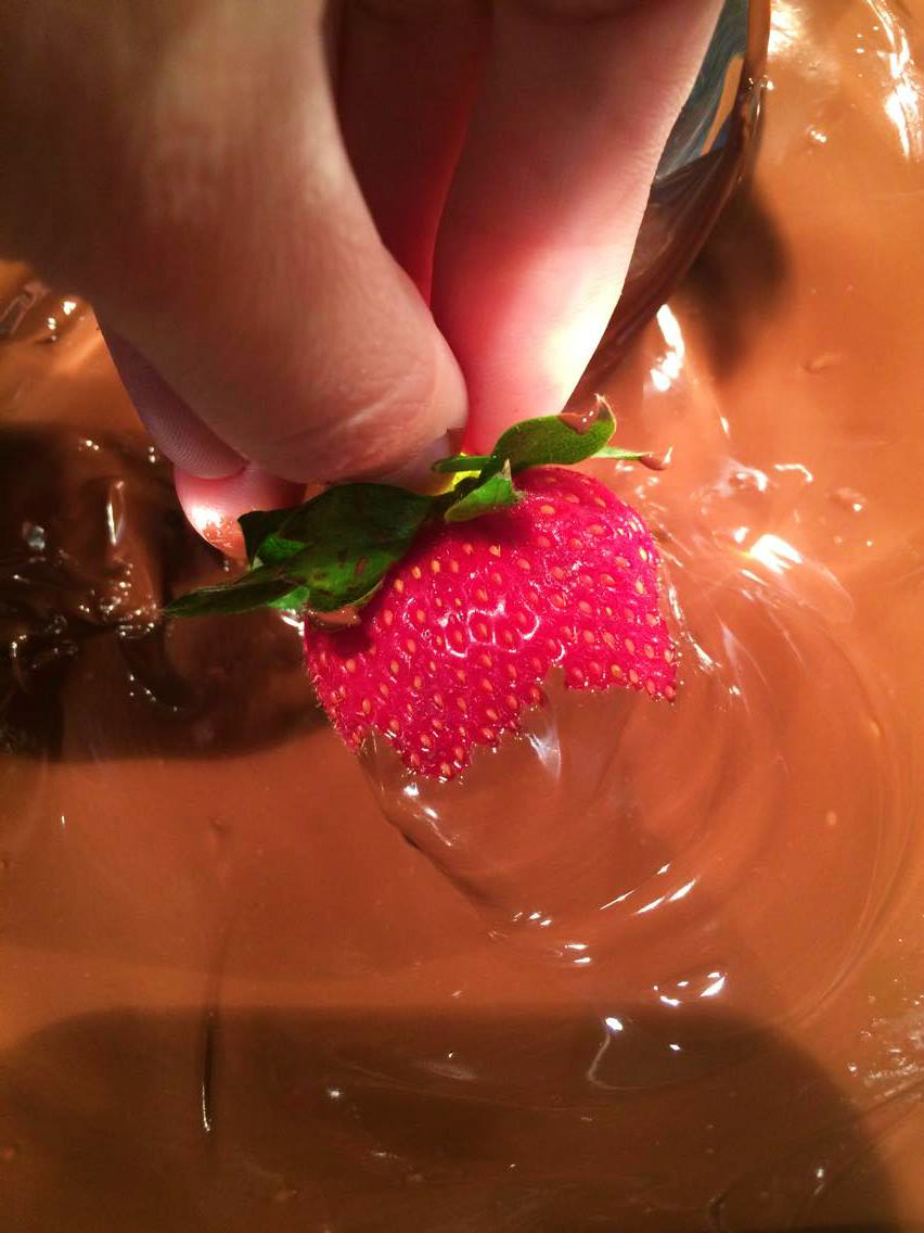 κρατώντας τη φράουλα από το κοτσάνι, τη βουτάς στη σοκολάτα!!! Είναι η πιο ωραία στιγμή της όλης διαδικασίας, αλλά θέλει προσοχή να μην λερωθείς και να απλωθεί η σοκολάτα όσο το δυνατόν πιο ομοιόμορφα και στις δύο πλευρές της φράουλας. Η σοκολάτα θα πρέπει να καλύπτει περίπου τα 3/4 της φράουλας χωρίς όμως να ακουμπήσει το κοτσάνι.