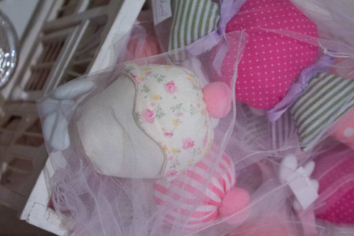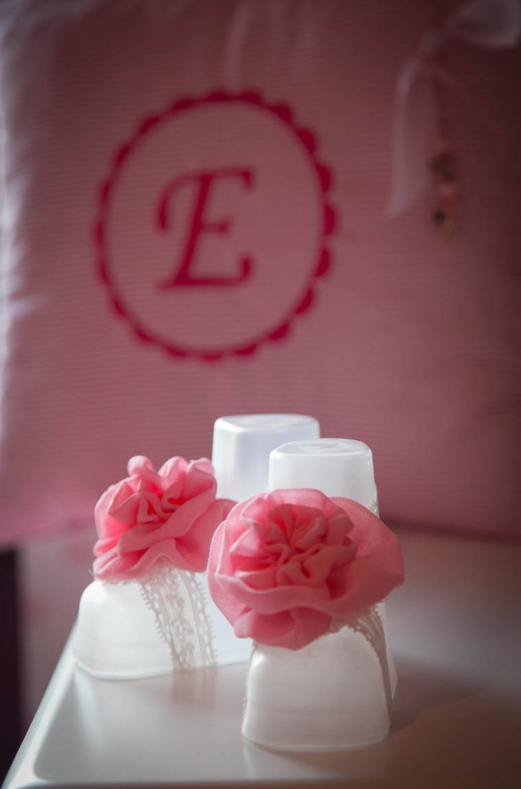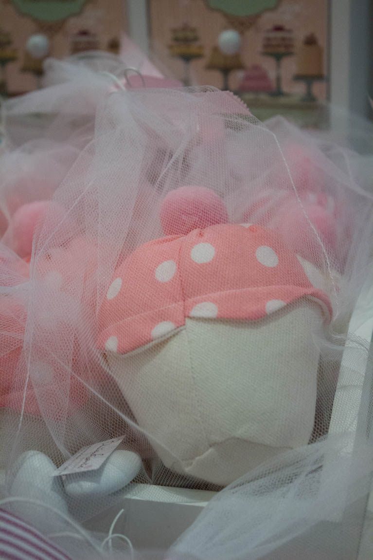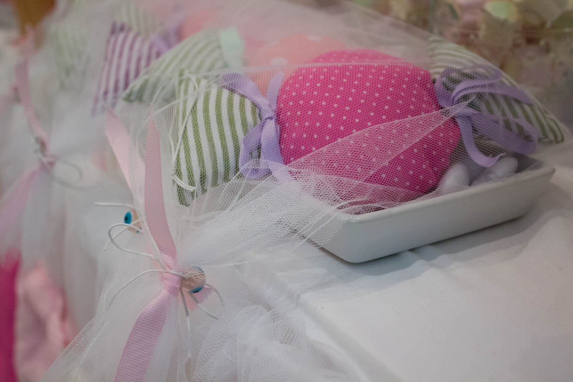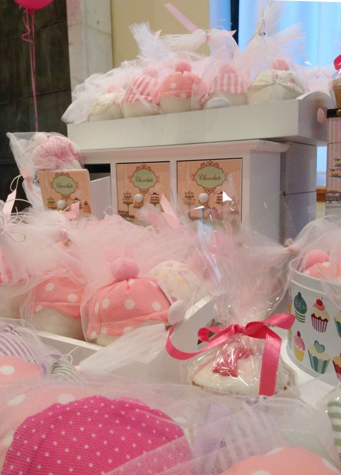 υπήρχαν πολλά μπαλόνια- ροζ, λευκά, πουά αλλά και σε σχήμα καραμέλας- όλα από το Mπουκέτο Μπαλόνια, pom-poms, γκοφρέ cupcakes & χάρτινα φαναράκια από το Hondos Center Απολλώνεια Πολιτεία και διακοσμητικά cupcakes με το αρχικό Ε από την Treasure Tales.