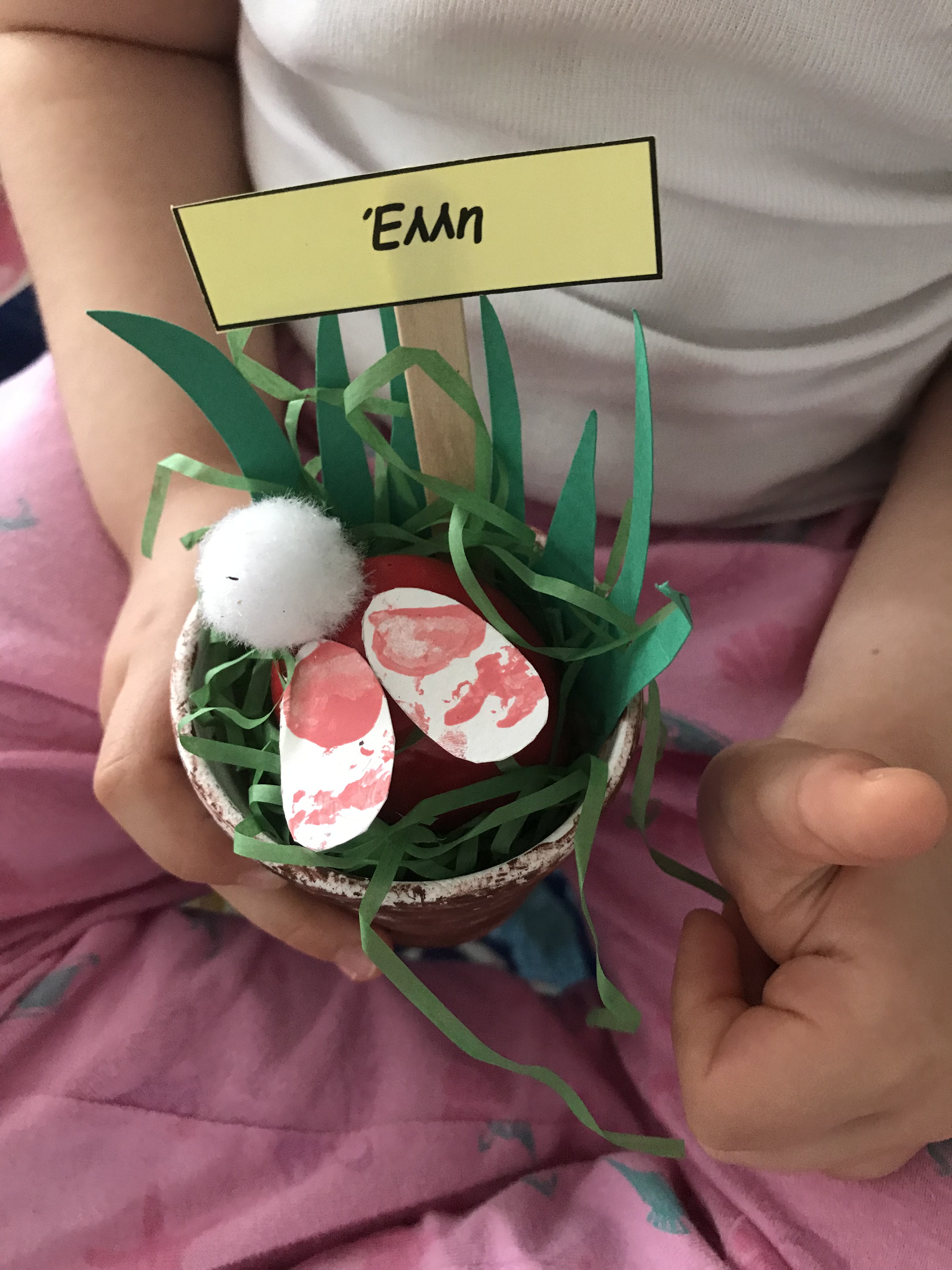 Το έφτιαξαν στο σχολείο της Έλλης μου και μ’ ενθουσίασε σαν ιδέα. Μπορούμε να χρησιμοποιήσουμε μικρό βαζάκι ή κασπό και να βάλουμε αληθινό κόκκινο βαμμένο αβγό ή σοκολατένιο ή ακόμα και διακοσμητικό. Τα πατουσάκια γίνονται κόβοντας δύο μικρά στρογγυλά κομμάτια χαρτόνι και τα ζωγραφίζουμε με ροζ μαρκαδόρο. Τέλος, τα κολλάμε μαζί με ένα μικρό λευκό πομ πομ πάνω στο αβγό και είναι έτοιμο!!