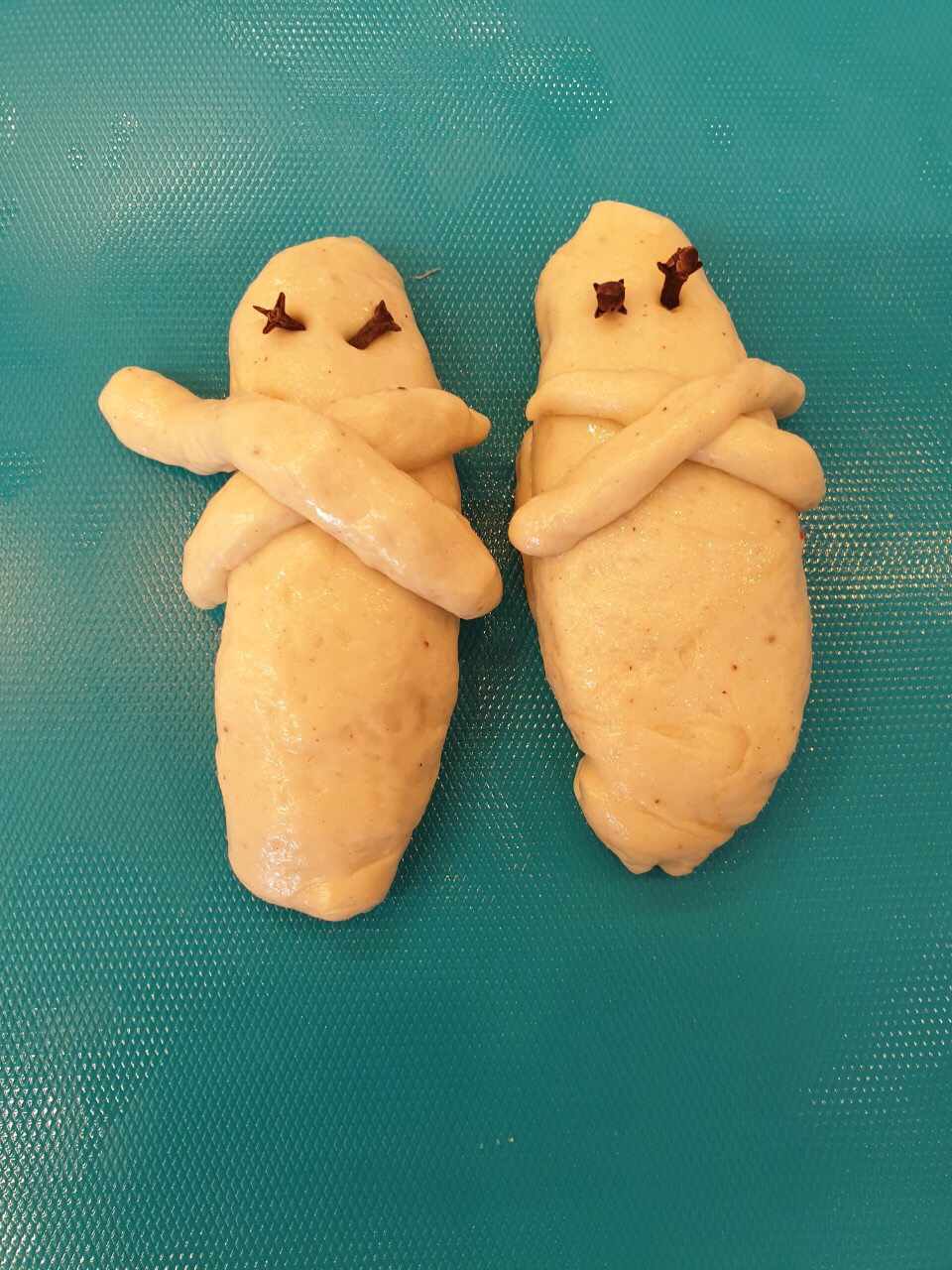 -Πλάθουμε το σώμα από τα λαζαράκια σε μακρόστενο σχήμα και γεμίζουμε 1 κ.γ. από τη γέμιση και το κλείνουμε καλά. Με την υπόλοιπη ζύμη φτιάχνουμε τα χεράκια τα οποία τα περνάμε χιαστί από την πίσω μεριά και καταλήγουν μπροστά πάλι σε σχήμα Χ. Βάζουμε 2 ολόκληρα γαριφαλάκια για μάτια.