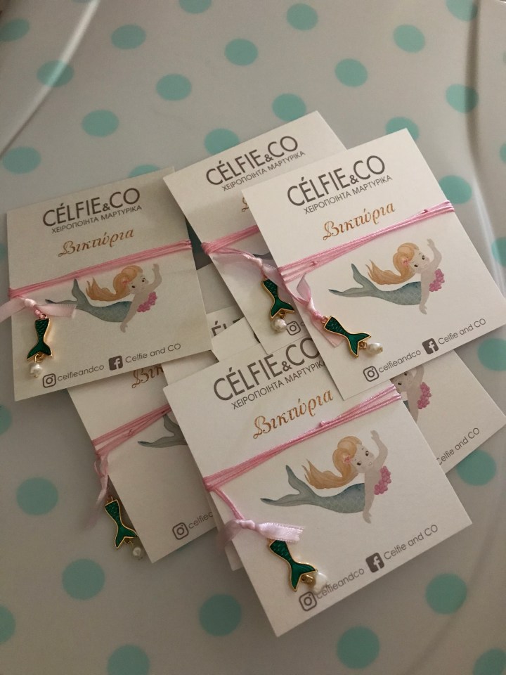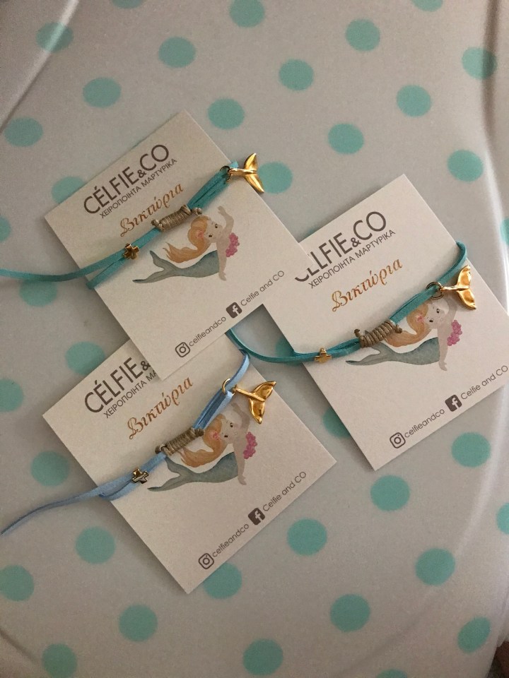 & στα φοβερά μαρτυρικά μας από τη celfie! Είναι καλοί επαγγελματίες & φτιάχνουν σίγουρα τα πιο ευφάνταστα μαρτυρικά! Μου ετοίμασαν λοιπόν μακρύ ροζ κρεμαστό με ουρά γοργόνας και περλίτσα για τα κορίτσια και βραχιόλια σε τιρκουάζ & σιέλ απόχρωση με χρυσή ουρίτσα και σταυρουδάκι για τα αγόρια!