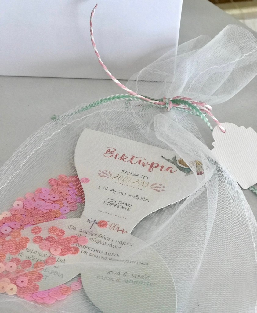 Στο υπερτέλειο προσκλητήριο σε σχήμα ουράς γοργόνας μέσα σε τούλινη θήκη μέσα στην οποία βάλαμε και ροζ ιριδίζουσες πούλιες…