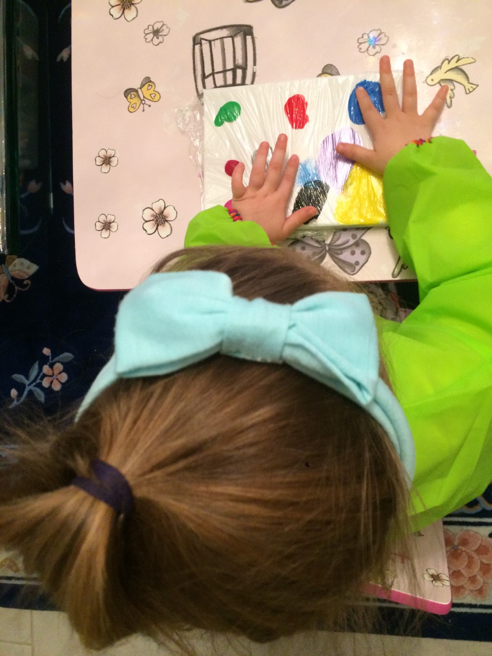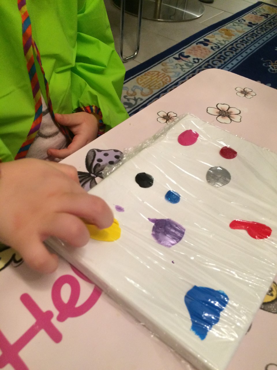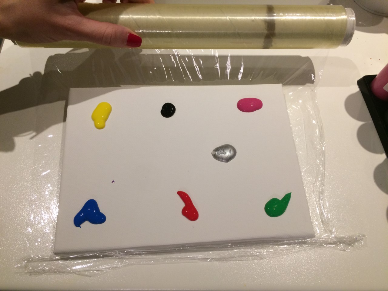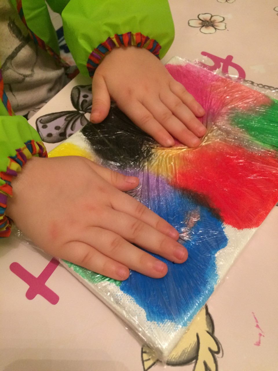 Βάζεις διαφορετικά χρώματα τέμπερας στον καμβά και από πάνω καλύπτεις με σελοφάν. Μετά αρχίζει το καλό😉 Με τα δάχτυλα, τα μικρά πιέζουν τα χρώματα τα οποία απλώνονται και αναμειγνύονται δημιουργώντας έργα τέχνης😍