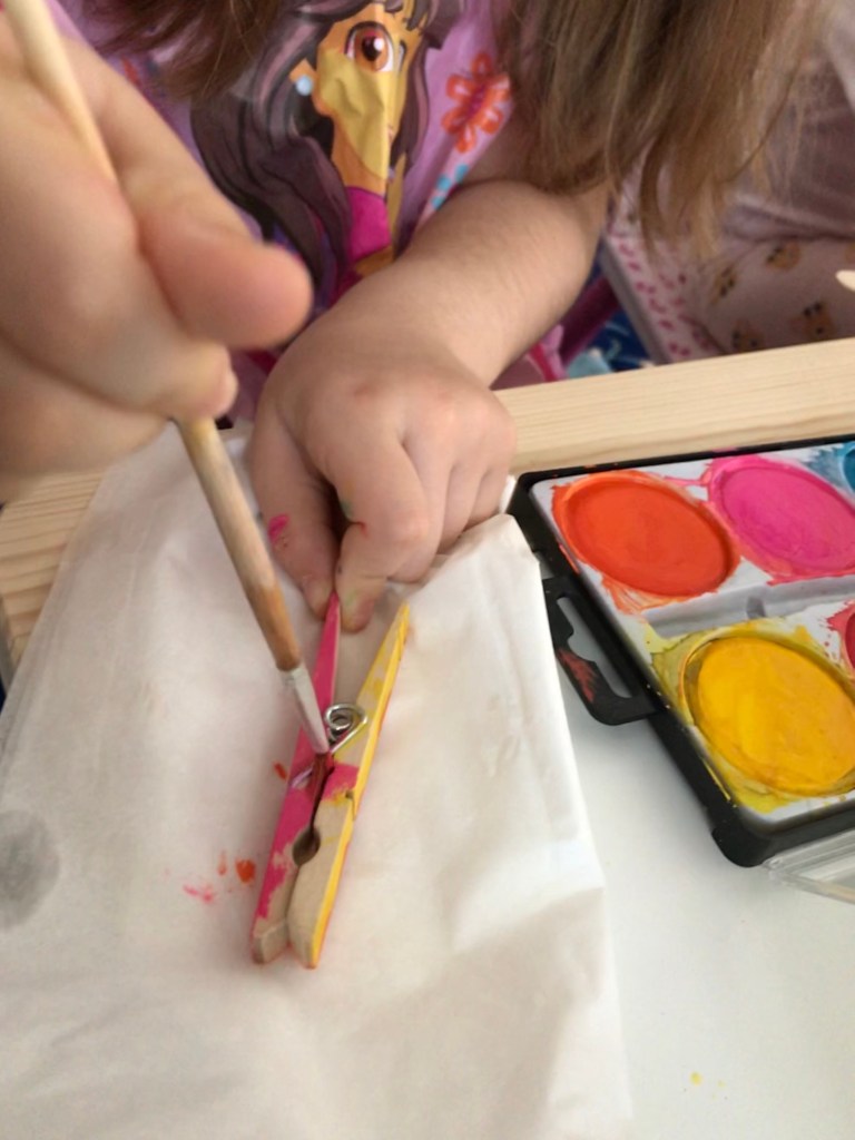 Πρώτα βάφουμε το μανταλάκι με όποιο χρώμα θελουμε είτε με νερομπογιές είτε με τέμπερες και το αφήνουμε να στεγνώσει.