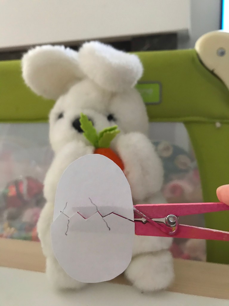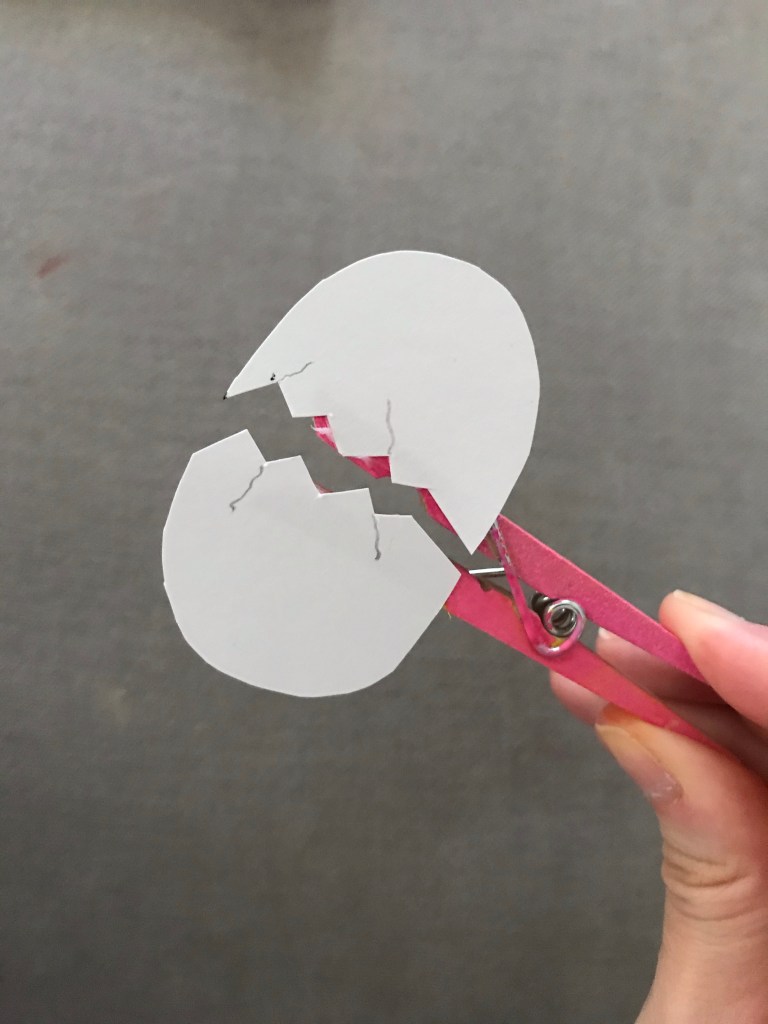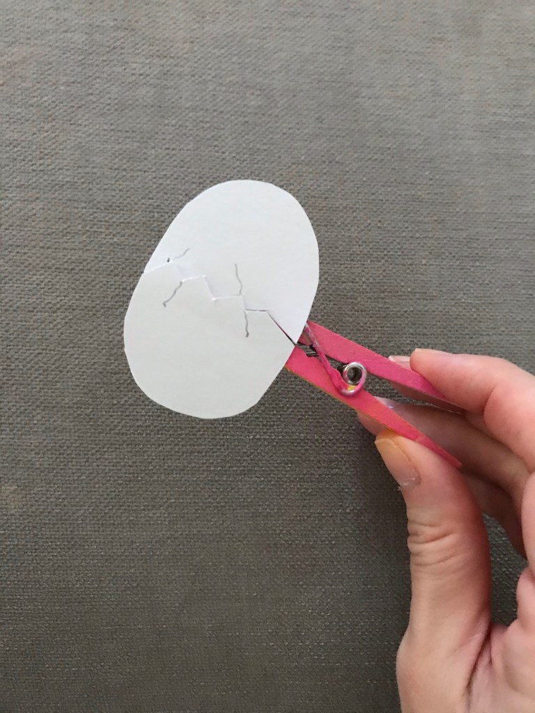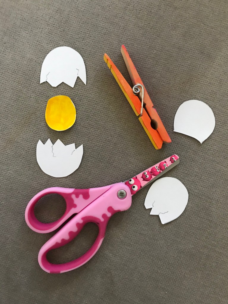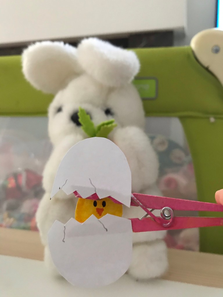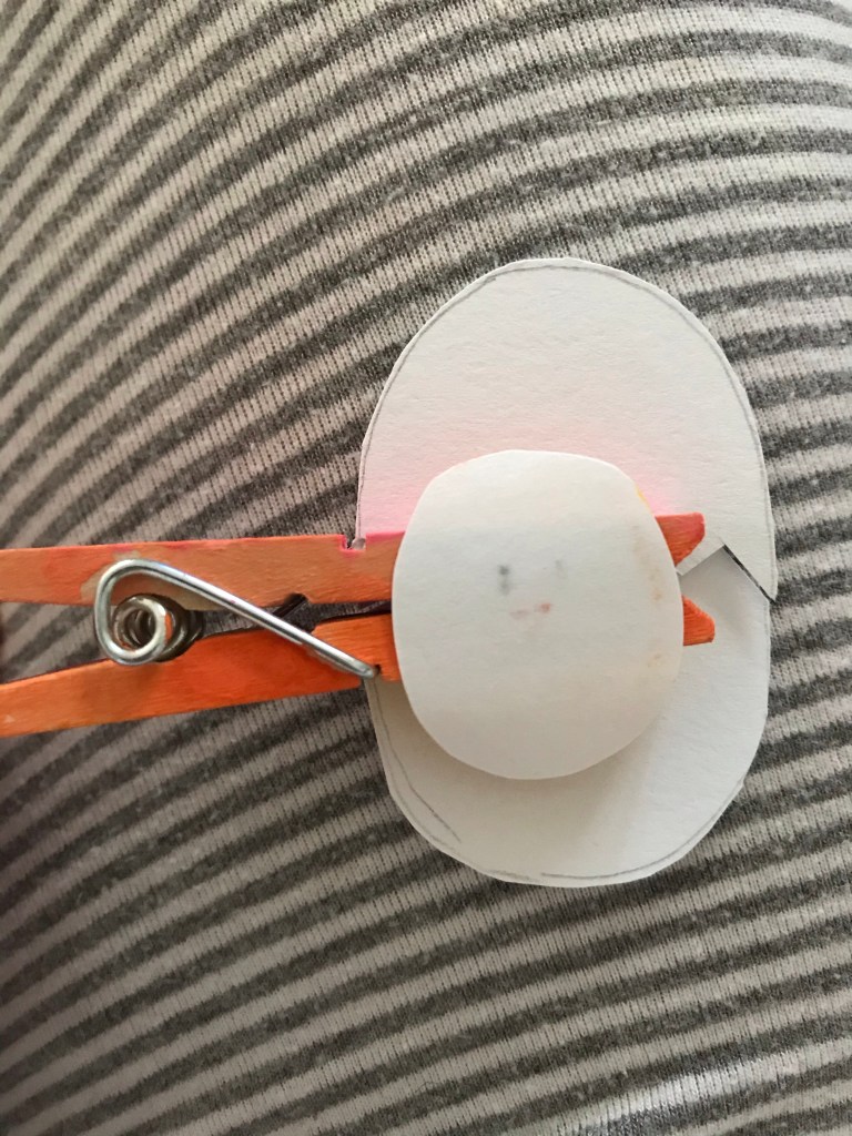 Συνεχίζουμε με το να κολλήσουμε τα μέρη στο μανταλάκι που στο μεταξύ έχει στεγνώσει. Μπροστά κολλάμε τα 2 μέρη του αβγού και πίσω το κοτοπουλάκι. Προσοχή! Μην ξεχάσεις να τσεκάρετε ότι ανοίγοντας το μανταλάκι φαίνονται τα ματάκια & το ράμφος του, αλλά και ότι κλείνοντας το μανταλάκι τα δυο μέρη του αβγού ενώνονται μεταξύ τους🐣
