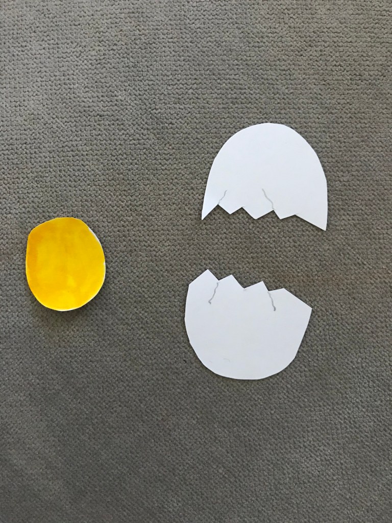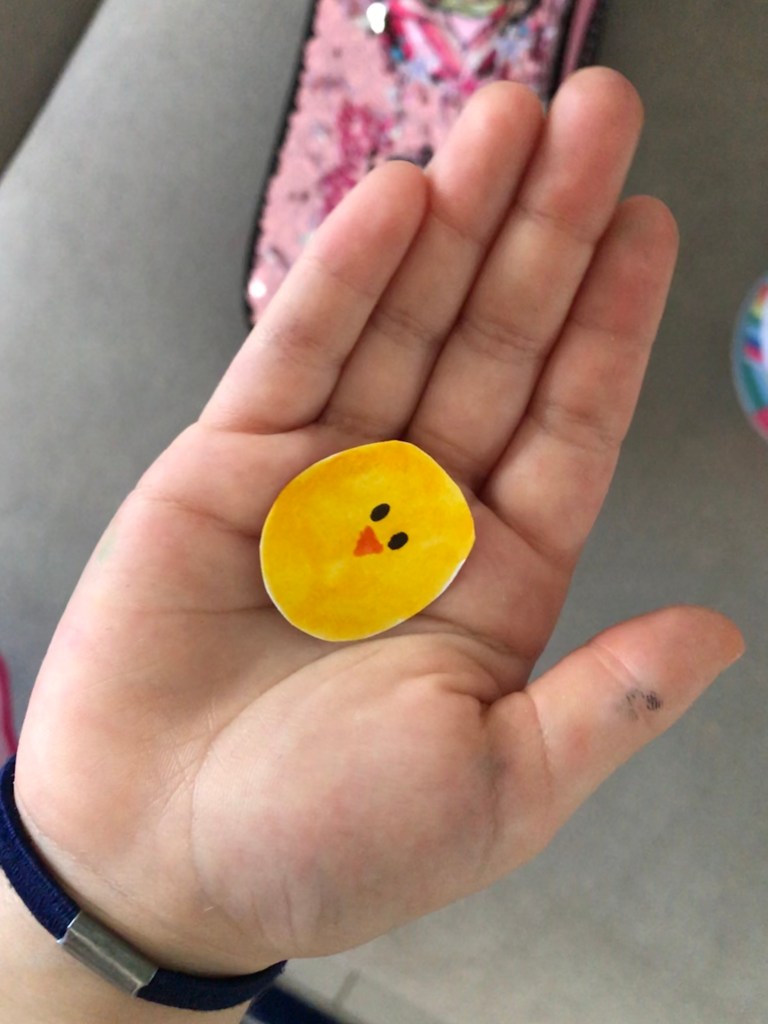 Για το κοτοπουλάκι κόβουμε απλά ένα στρογγυλό κομμάτι και το βάφουμε κίτρινο, προσθέτουμε μαύρα ματάκια & πορτοκαλί ράμφος.