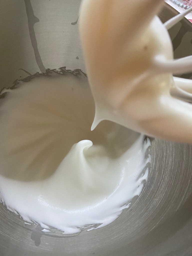 - Χτυπάς στο μίξερ σε σφιχτή μαρέγκα τα ασπράδια. Ενώ χτυπιέται η μαρέγκα, βάζεις τμηματικά σε 3 δόσεις τη ζάχαρη. Η μαρέγκα είναι έτοιμη όταν κάνει τις γνωστές κορυφές