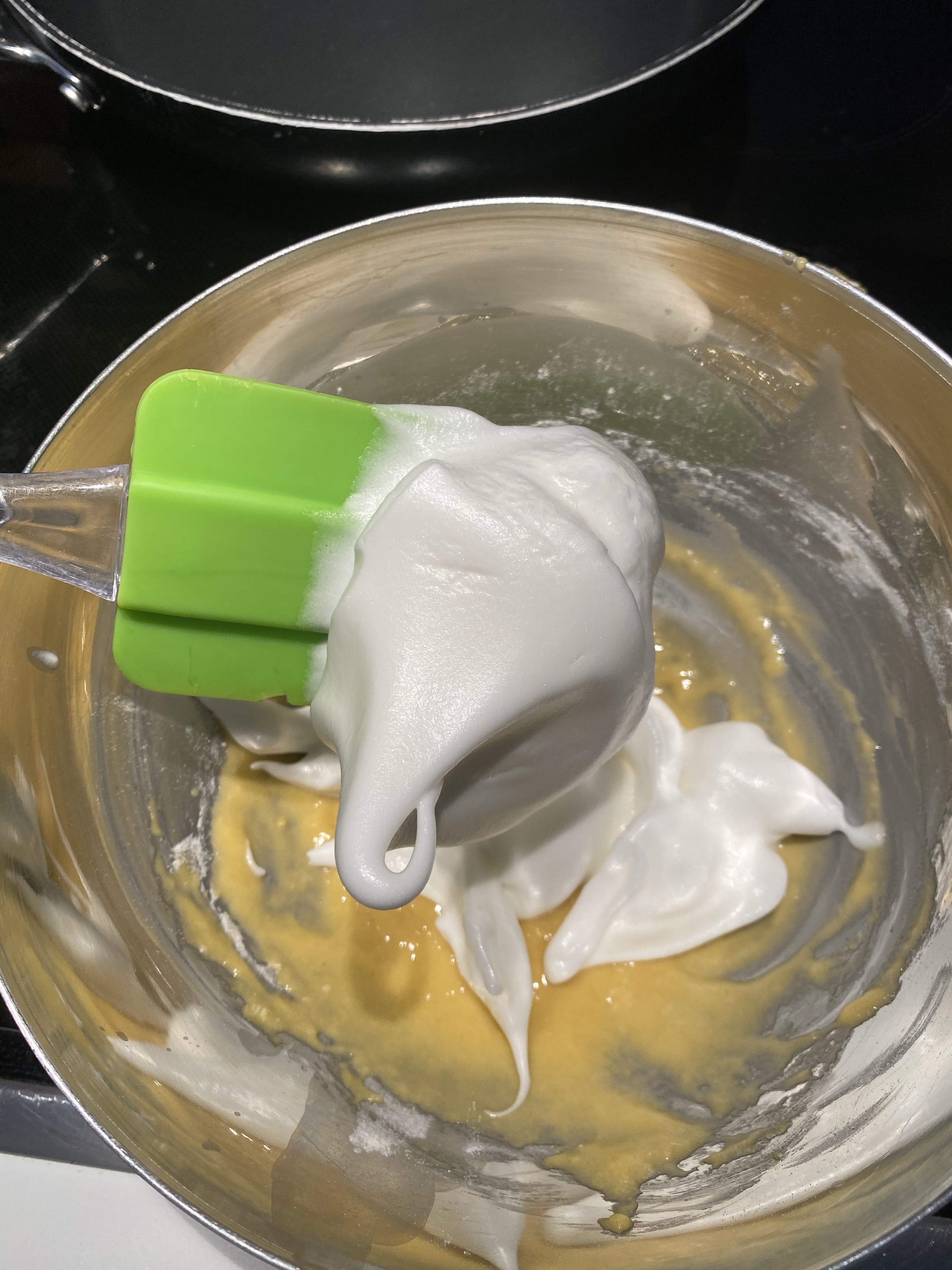 - Τώρα θα ενσωματώσεις τη μαρέγκα στο μείγμα με τους κρόκους & το αλεύρι με απαλές πάντα κινήσεις. Θα είναι σα να διπλώνεις το μείγμα