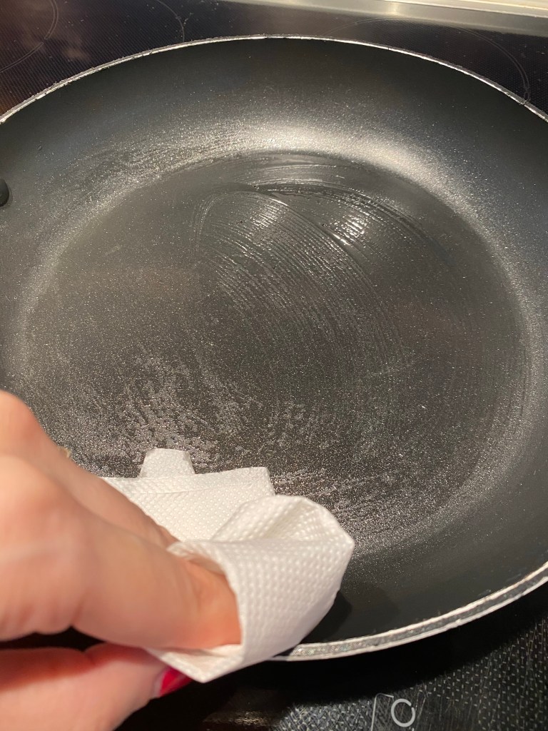 - & τώρα η ώρα του ψησίματος. Βάζεις ένα τηγάνι σε χαμηλή φωτιά (με μέγιστη το 9, εγώ βάζω στο 5) και περνάς την επιφάνεια του με μια λιπαρή ουσία (βούτυρο, ελαιόλαδο ή ηλιέλαιο)