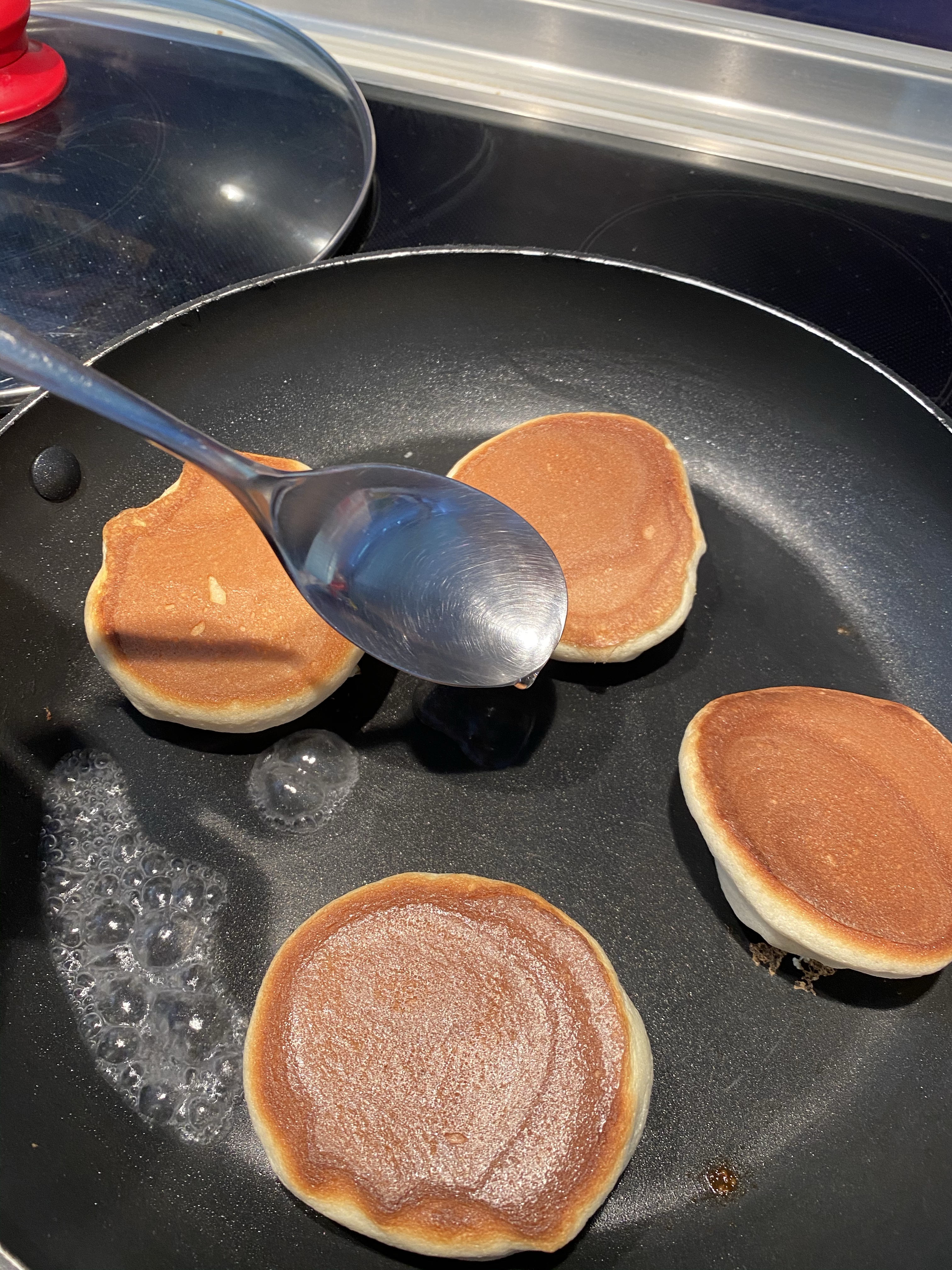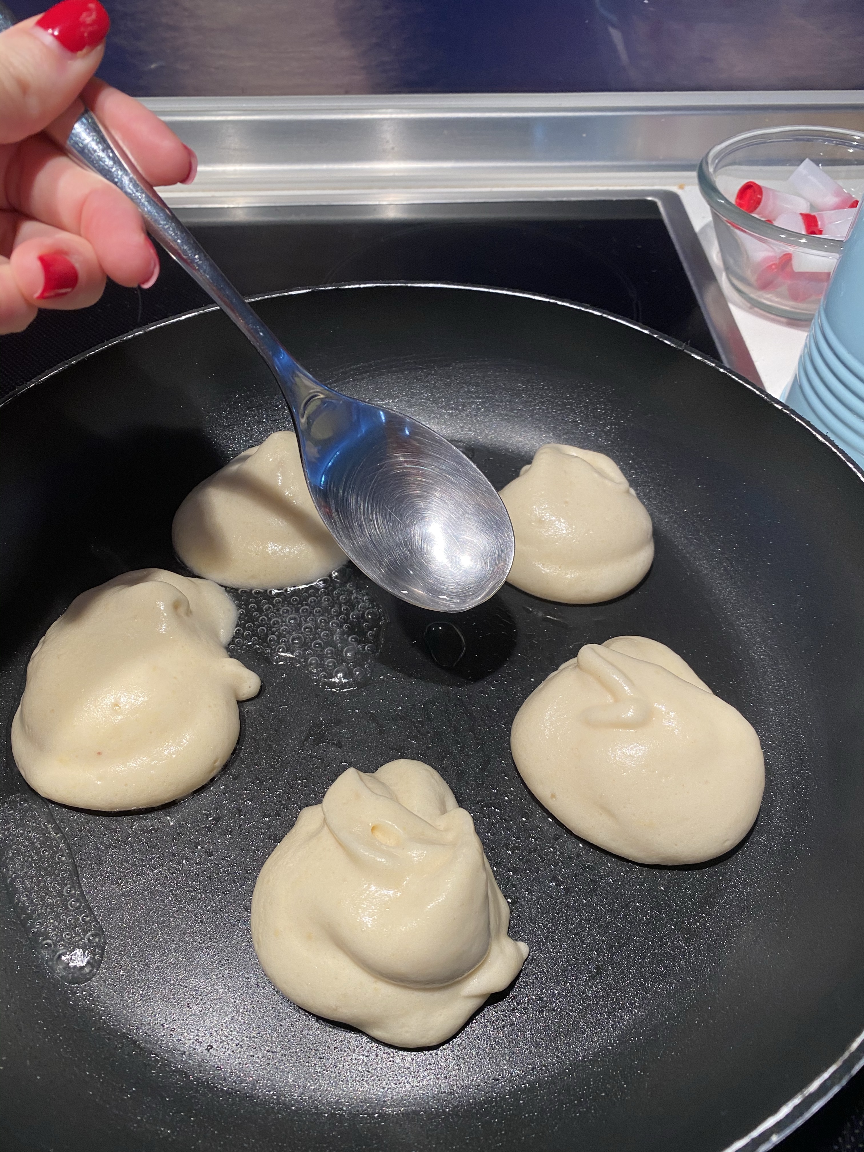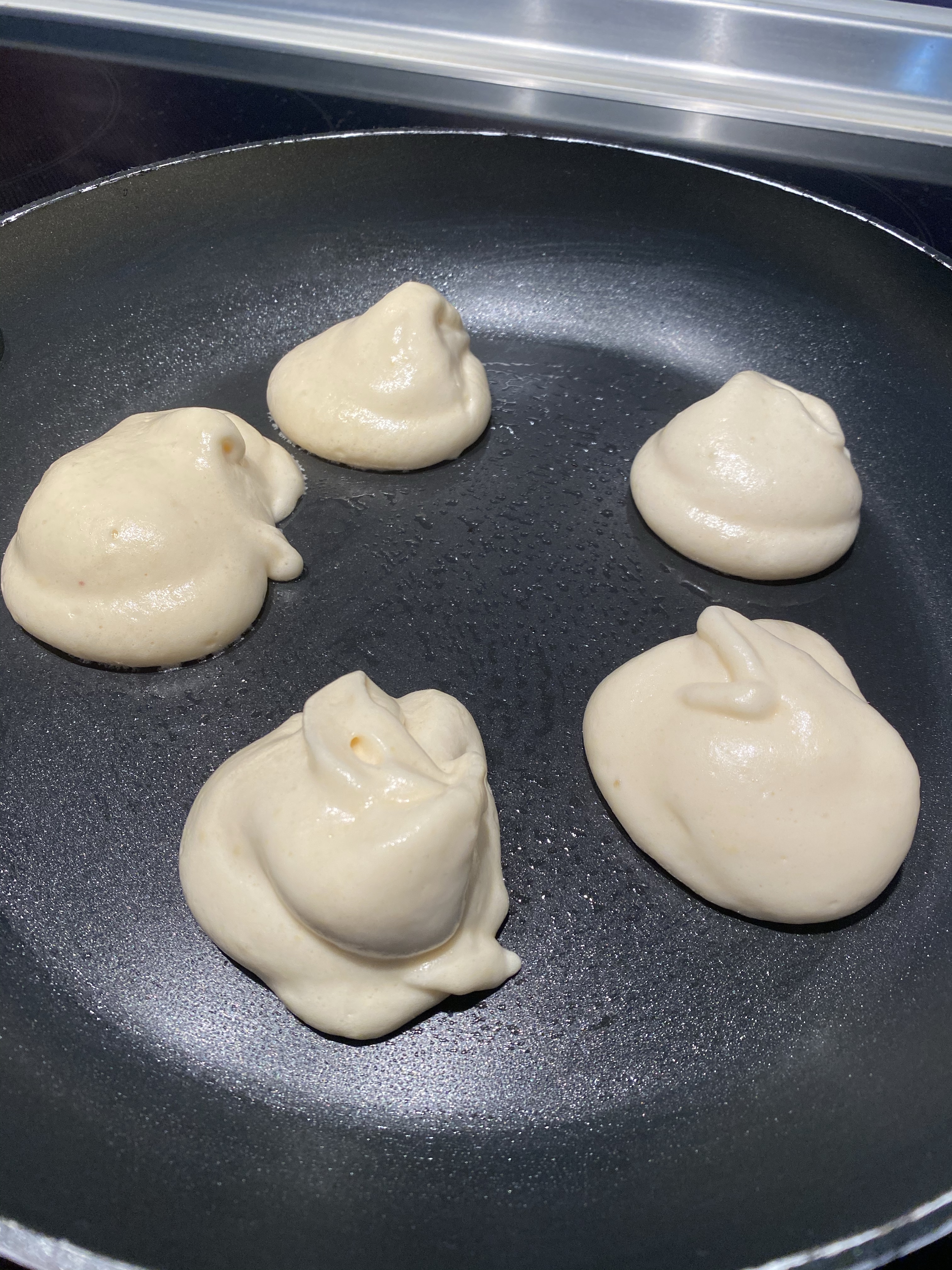 - Αφού ζεσταθεί το τηγάνι, είτε με κορνέ είτε με κουτάλι (εγώ χρησιμοποιώ το scoop για τα παγωτά) βάζεις από μια κουτάλια για κάθε pancake και αμέσως βάζεις άλλη μια κουτάλια πάνω από το καθένα. Ουσιαστικά δηλαδή 2 κουταλιές για κάθε pancake, η μια πάνω από την άλλη.