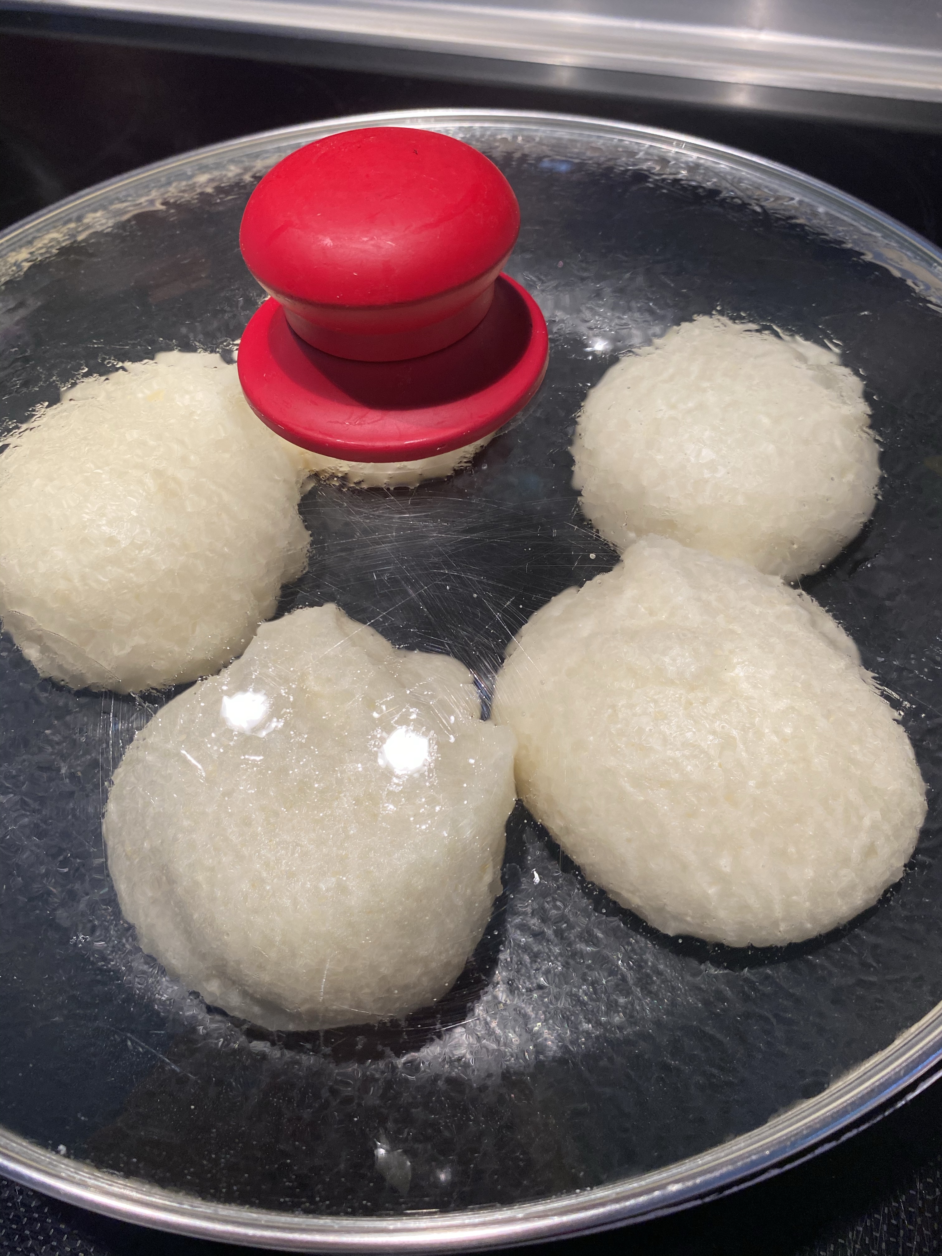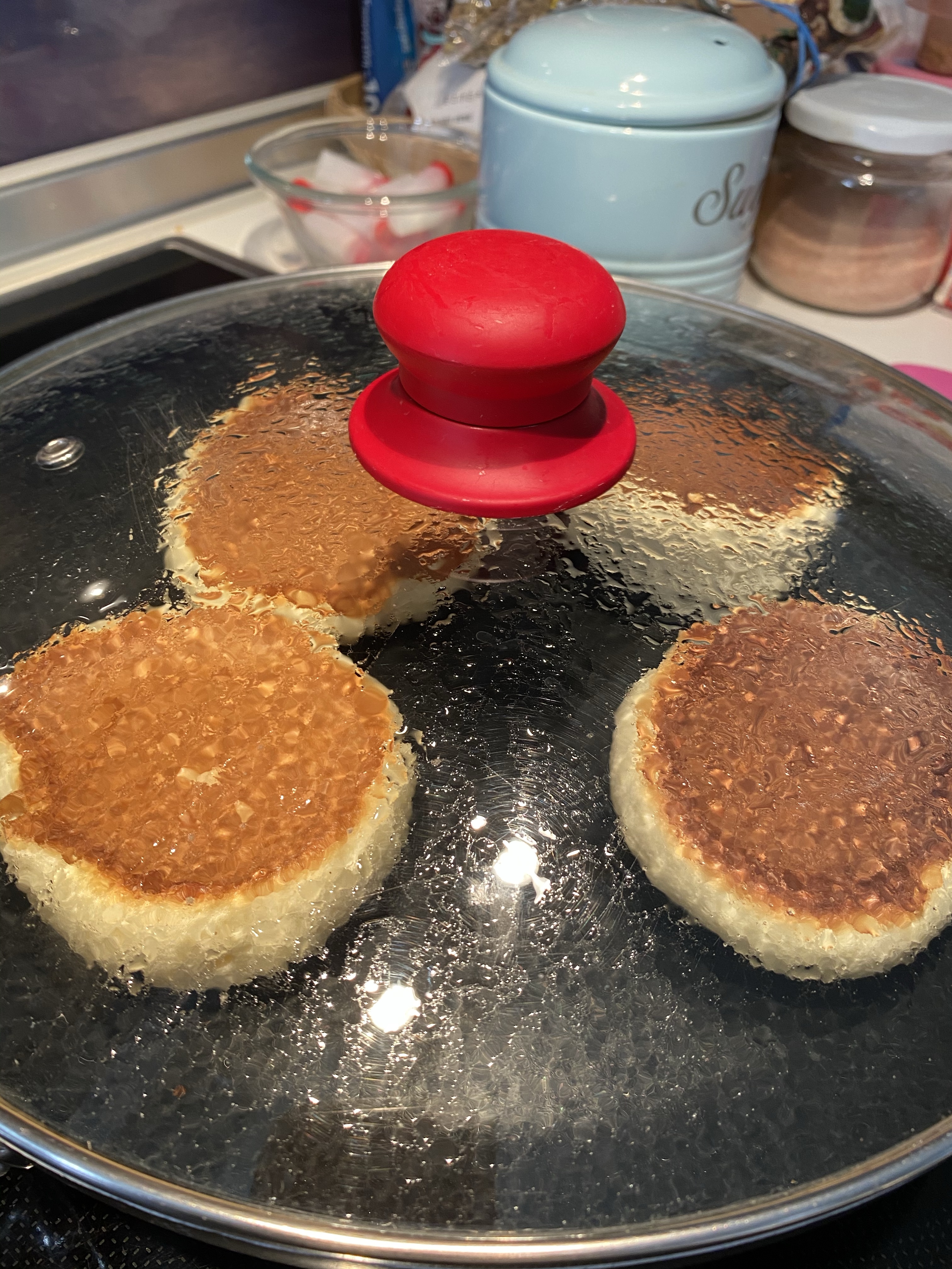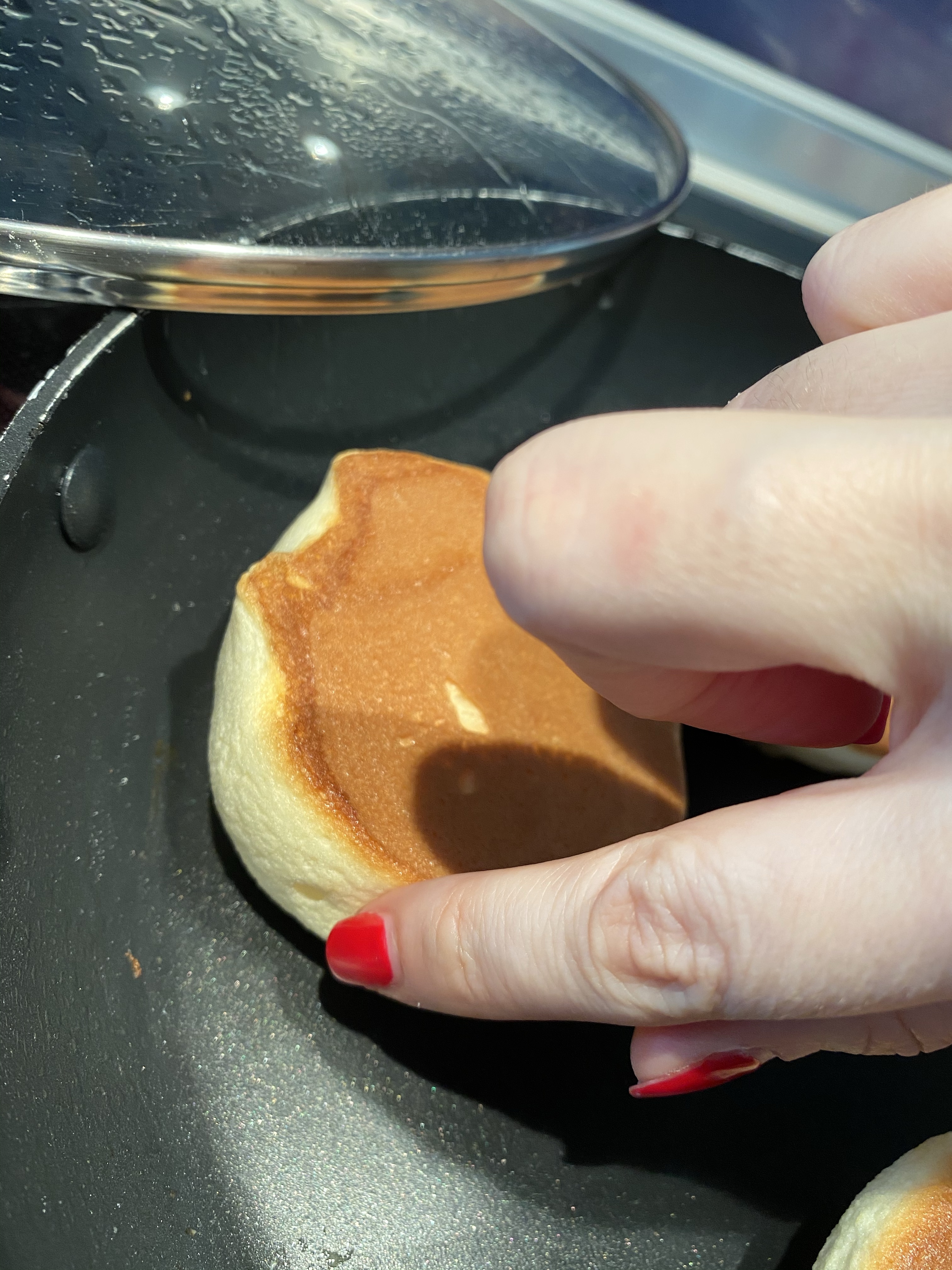 - Προσθέτεις δυο με τρεις κουταλιές νερό στο τηγάνι (όχι πάνω στα pancakes!) και κλείνεις με το καπάκι. Αφήνεις να ψηθούν χρονομετρημένα για 5 λεπτά σε χαμηλή σχετικά θερμοκρασία (εγώ το έχω στο 5 με μέγιστη το 9).