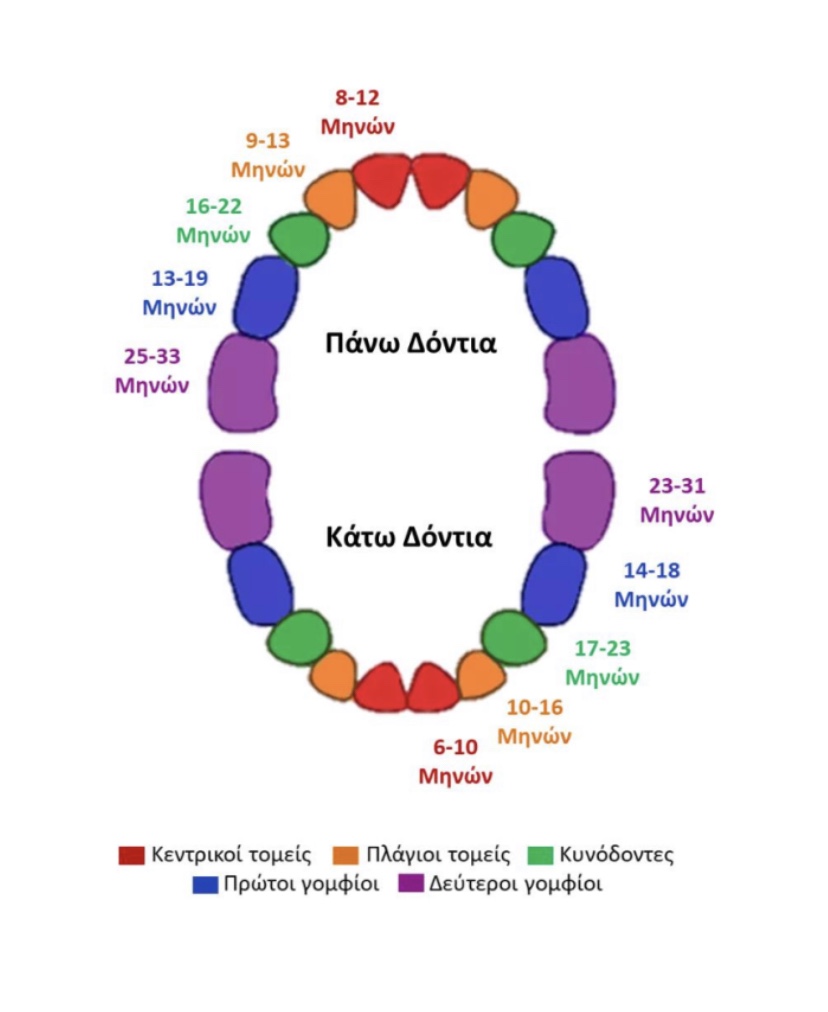 Το πρώτο δόντι του μωρού εμφανίζεται συνήθως ανάμεσα στον 6ο και τον 8ο μήνα και είναι συνήθως ο κάτω τομέας. Μεταξύ 8ου και 12ου μήνα ανατέλλουν οι άνω τομείς. Μέχρι την ηλικία των 3 ετών έχουν συνήθως ανατείλει και τα 20 νεογιλά δόντια. Η πρώιμη ή η καθυστερημένη ανατολή των δοντιών δεν σχετίζεται απαραίτητα με κάποιο πρόβλημα. Εάν όμως μέχρι το 12ο μήνα δεν έχει εμφανιστεί το πρώτο νεογιλό δόντι θα πρέπει οι γονείς να συμβουλευτούν τον Παιδοδοντίατρο.