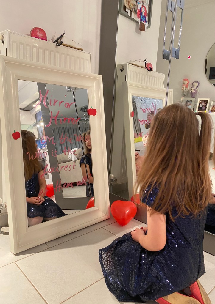 Οι δυο όμως πολύ αγαπημένες μου πινελιές ήταν: 1. Τα λόγια της κακιάς βασίλισσας Mirror Mirror 🪞 on the wall, who is the fairest of them all που έγραψα με κόκκινο κραγιόν πάνω σε έναν καθρέπτη…