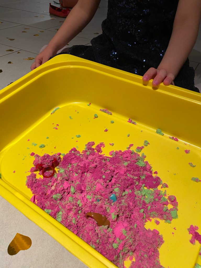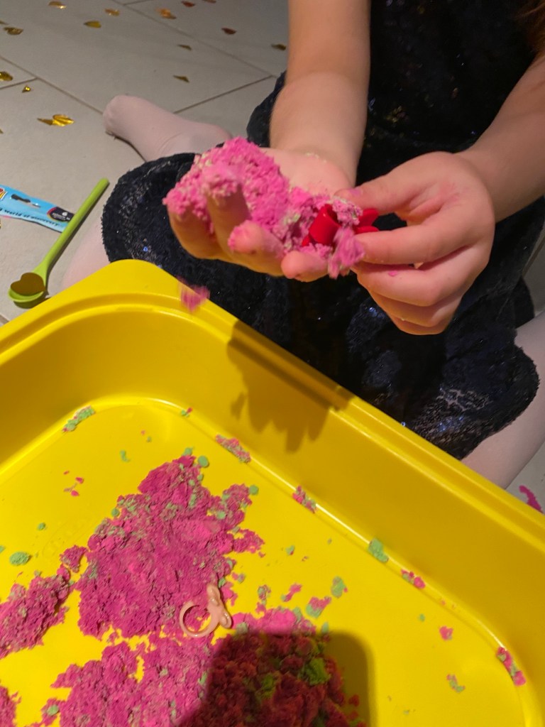 Συγκεκριμένα, έκρυψα πετράδια, χάντρες & ψεύτικα δαχτυλίδια μέσα σε μαγική άμμο σε ένα κουτί και τις έβαλα να τα βρουν😉 Οι νάνοι στο παραμύθι σκάβουν στη γη για να βρουν πολύτιμους λίθους και από εκεί προέκυψε και η συγκεκριμένη δραστηριότητα. Σίγουρα βέβαια θα ήταν ακόμα πιο διασκεδαστικά αν είχαμε και αλλά παιδάκια να συμμετέχουν, αλλά και πάλι είχε πλάκα 🎉