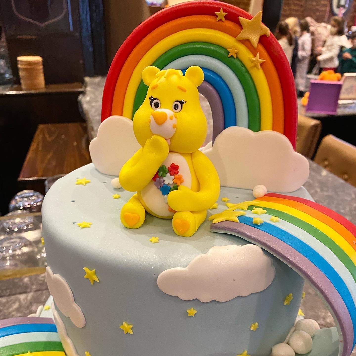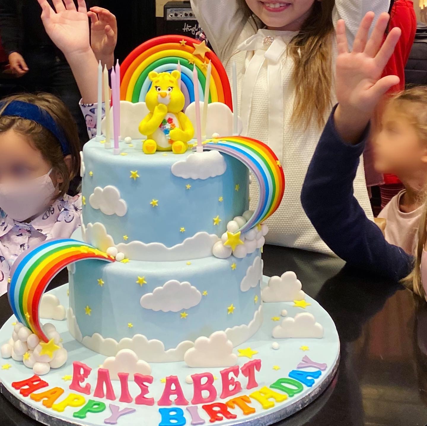 είναι το απόλυτο highlight κάθε πάρτι & ήταν και φέτος υπερπαραγωγή!!! Την κάναμε με 2 ορόφους-ο ένας ήταν «ψεύτικος»- με λευκό παντεσπάνι & γέμιση σοκολάτα και όλος ο εντυπωσιακός στολισμός ήταν από ζαχαρόπαστα🌈 Ενθουσιάστηκε φυσικά η εορτάζουσα που την διάλεξε μέσα από πολλάααααα σχέδια & είχε ζητήσει το κεντρικό αρκουδάκι να είναι κίτρινο 💛 Μας την έφτιαξε η αγαπημένη Sugarela και ήταν πεντανόστιμη 😋