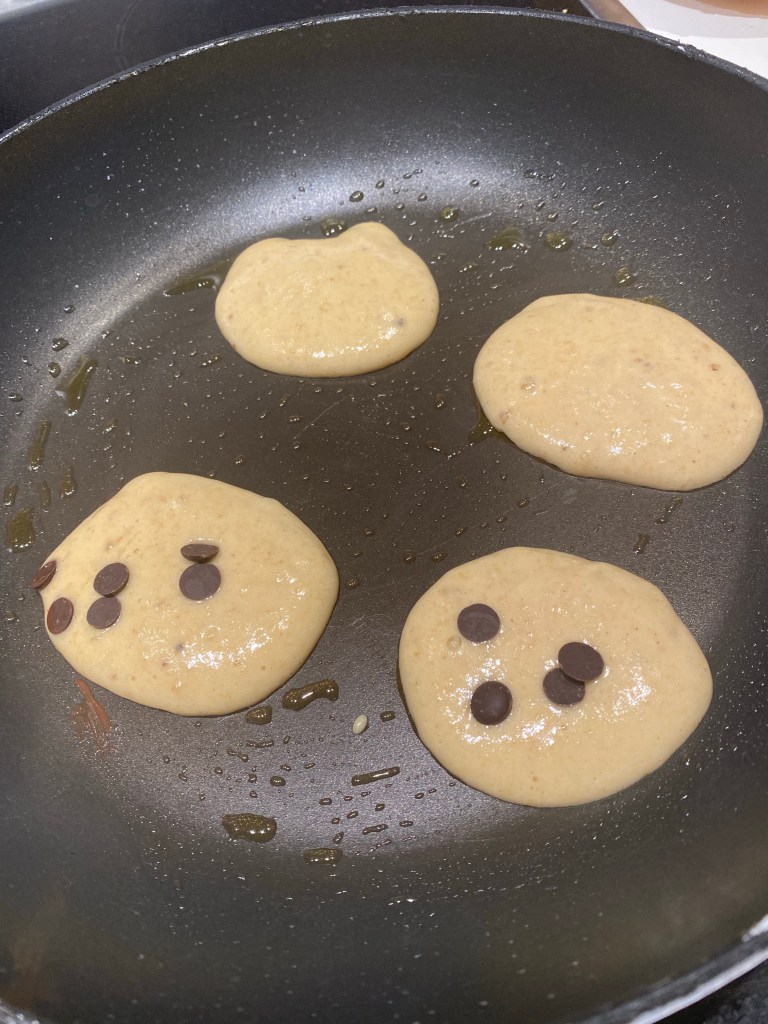 Έπειτα βάζεις το τηγάνι σου σε χαμηλή φωτιά (στο 6 με μαξ το 9) και βάζεις από μια κουτάλια της σούπας για το κάθε μπανανo-pancake 😉 Προσοχή όταν τα ψήνεις να μην αρπάξουν-είναι μικρά σε μέγεθος και γίνονται γρήγορα.