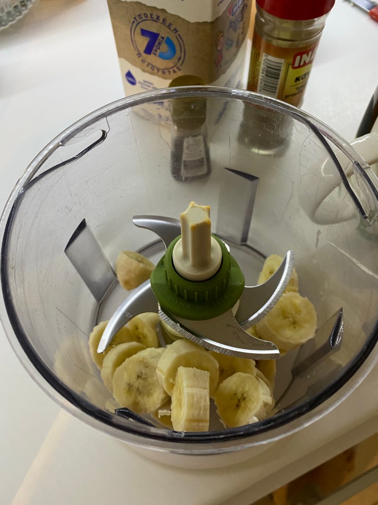 Είτε λιώνεις την μπανάνα με το πιρούνι, προσθέτεις τα υπόλοιπα υλικά και ανακατεύεις μέχρι να γίνει ένα λείο μείγμα είτε τα βάζεις όλα στο μούλτι… προσωπικά αυτό τον τρόπο προτιμώ.