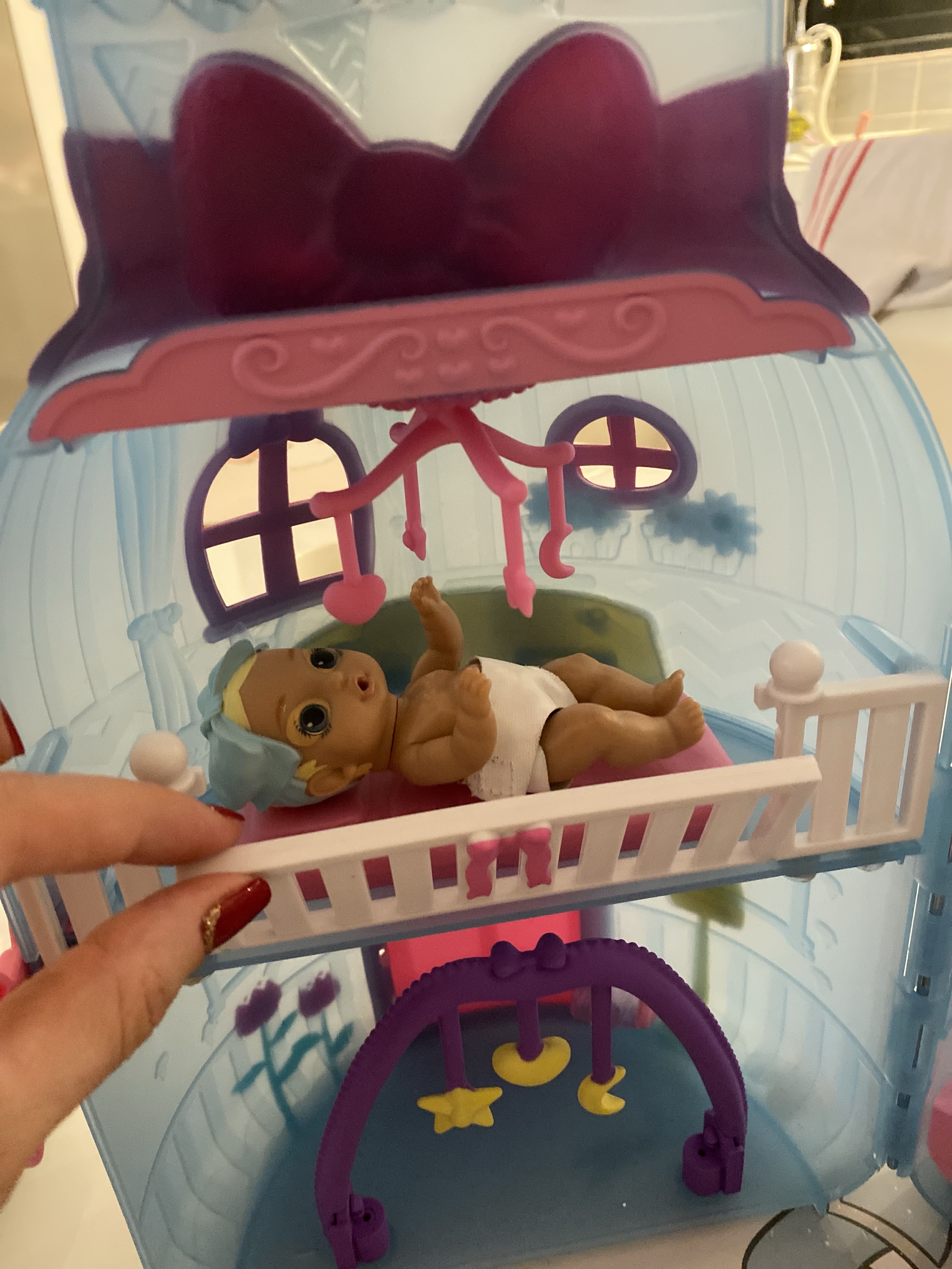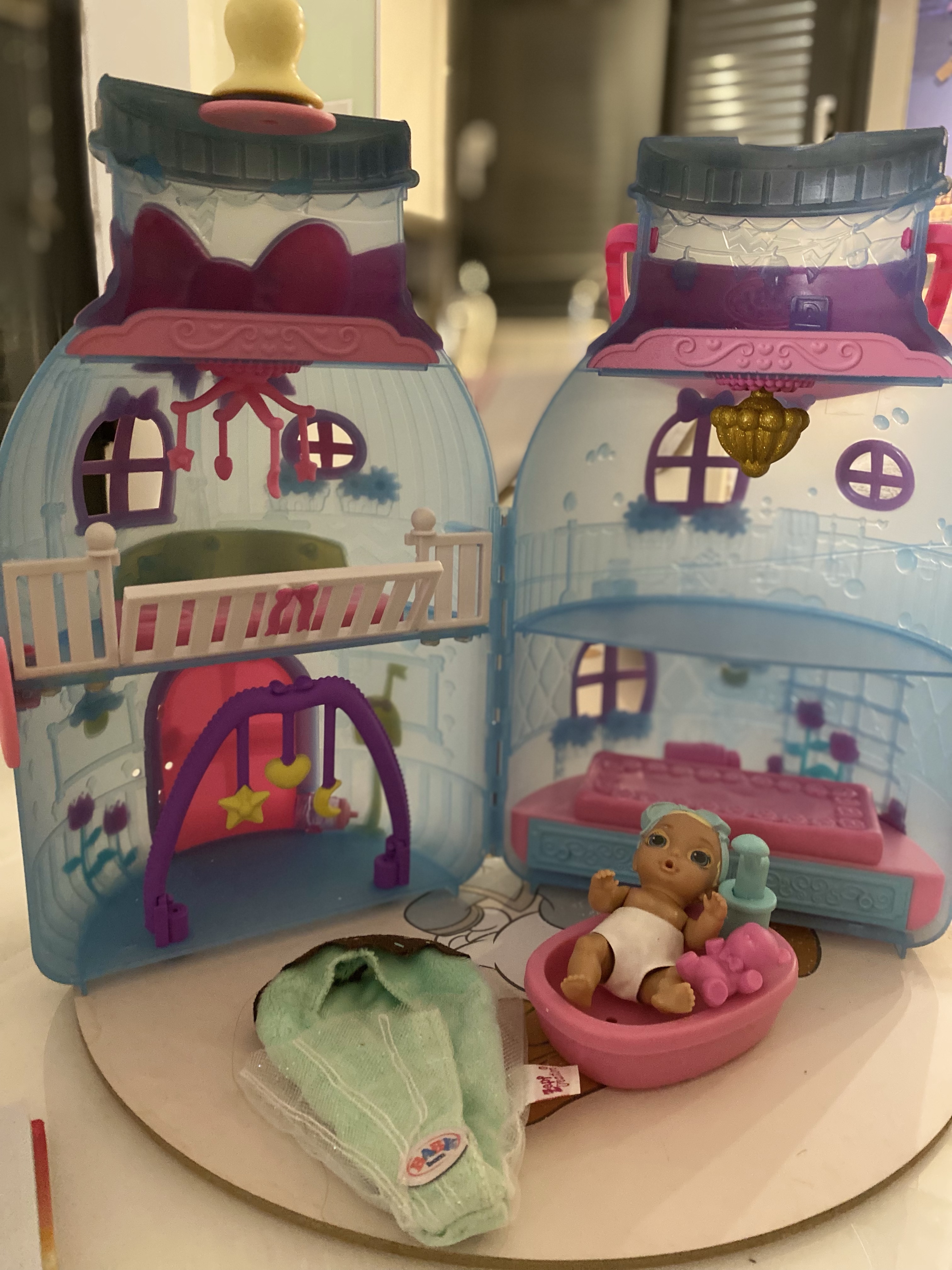 Είναι ένα όμορφο και μεγάλο σπίτι σε σχήμα μπουκάλι-μπιμπερό που ανοίγει και έχει μέσα ένα μωράκι έκπληξη (μέγεθος 11 εκατοστά) και μαζί 11 διαφορετικά αξεσουάρ να ανακαλύψεις. Συστήνεται για παιδάκια από 3 ετών και πάνω, ενώ κοστίζει 60€.