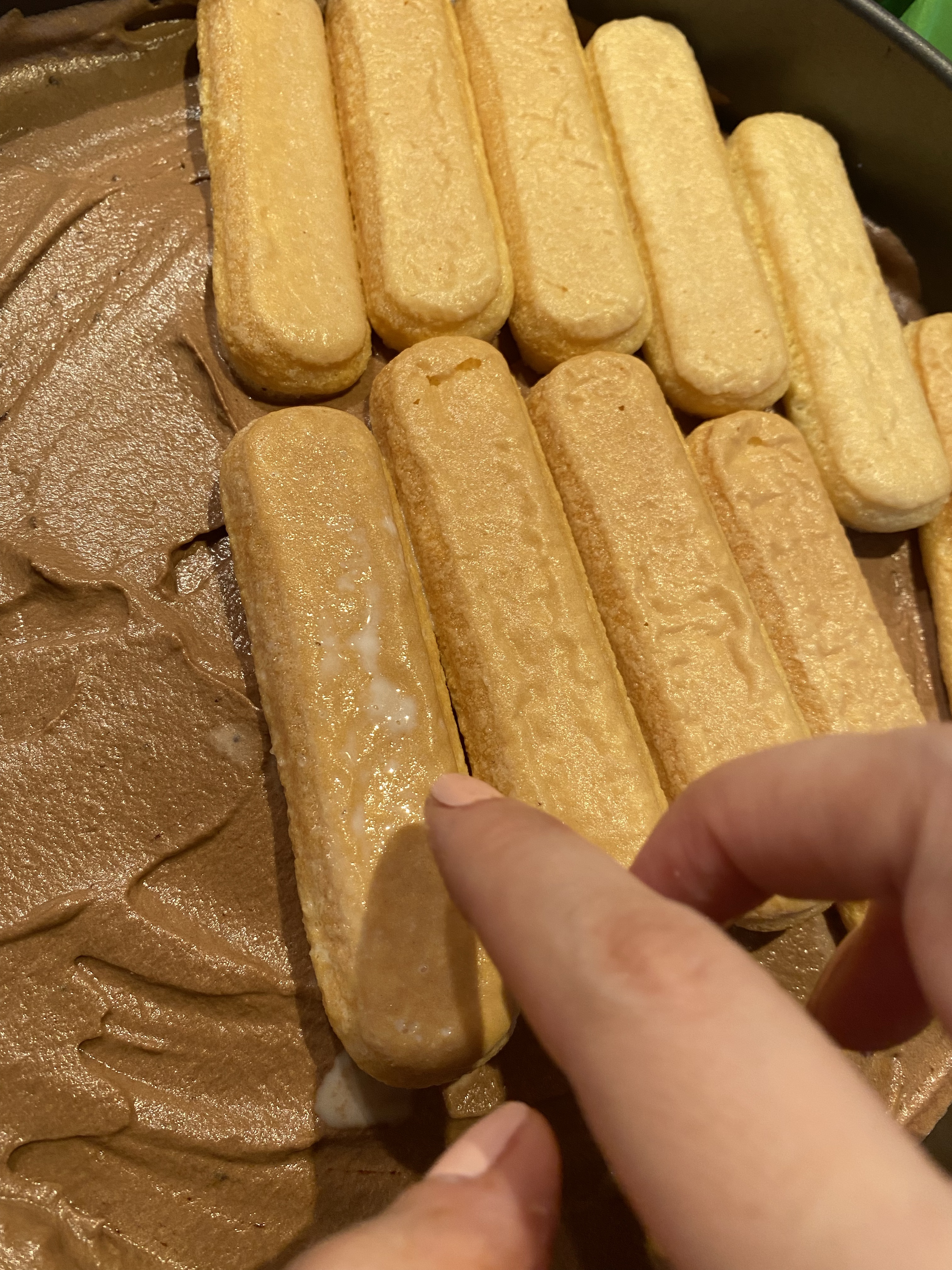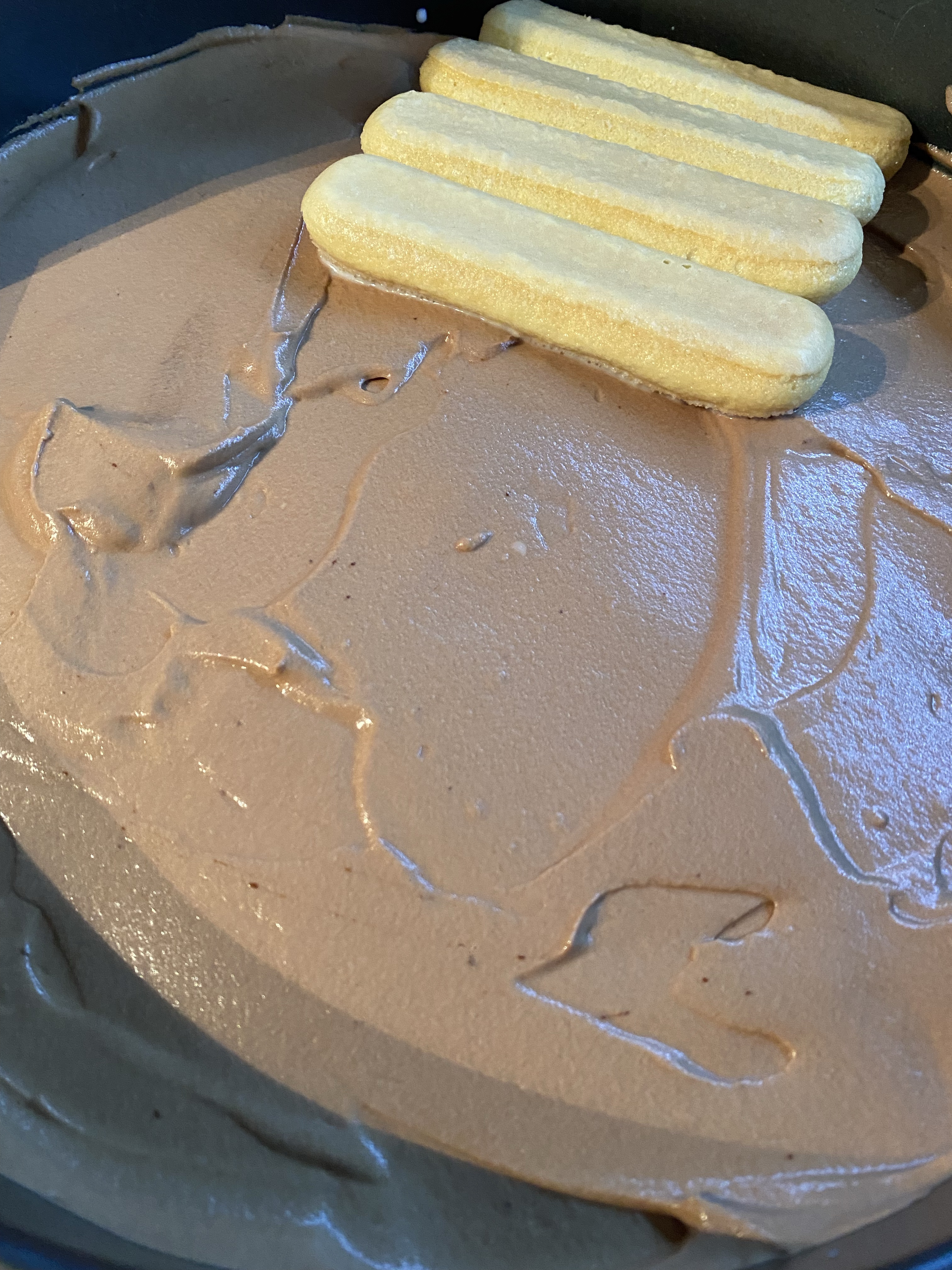 Και τώρα το στήσιμο της τούρτας μας! Βάζουμε σε ένα μπολ γάλα και λίγο κονιάκ (αν έχουμε παιδιά, παραλείπουμε το αλκοόλ). Βουτάμε ένα ένα τα σαβαγιάρ στο γάλα και τα τοποθετούμε στη βάση του τσέρκι/φόρμας μας-Προσοχή! Η πλευρά του σαβαγιάρ με τη ζάχαρη μπαίνει στο κάτω μέρος. Επίσης, δεν τα «μουλιάζουμε» υπερβολικά πολύ γιατί θα αρχίσουν να λιώνουν-απλά τα βρέχουμε καλά και από τις δυο πλευρές.