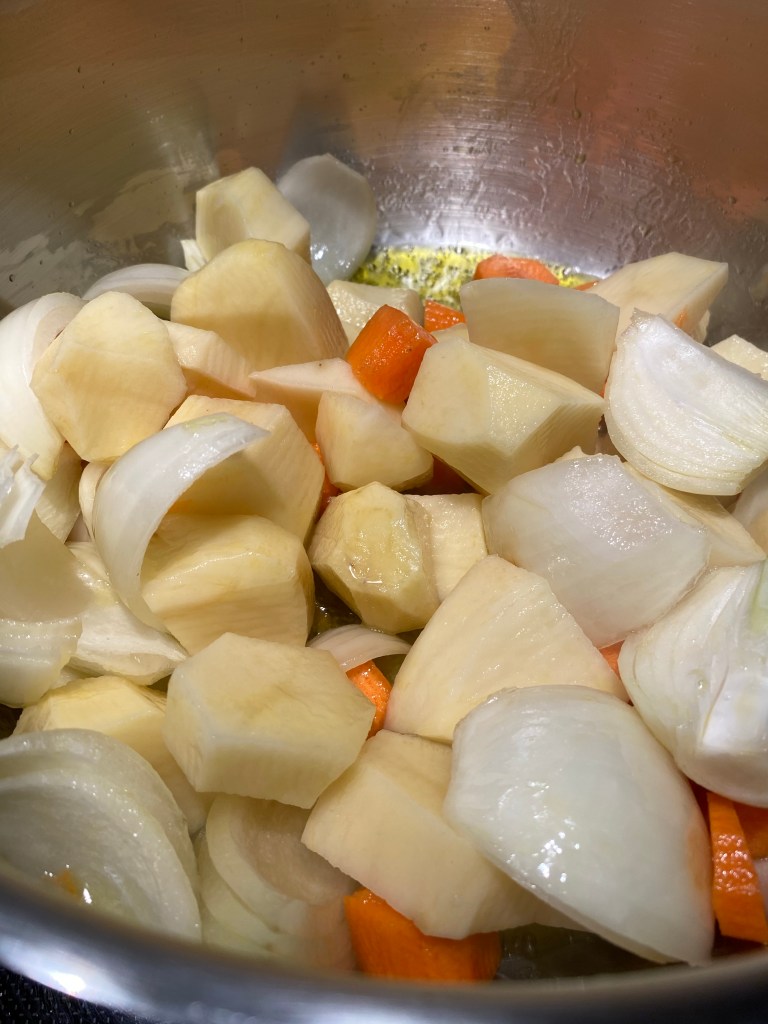 - Βάζουμε σε μια βαθιά κατσαρόλα λίγο ελαιόλαδο & περίπου 25-30 γρ. βούτυρο και τσιγαρίζουμε όλα τα λαχανικά μαζί, τα οποία φυσικά τα έχουμε πρώτα πλύνει πολύ καλά και κόψει σε κομμάτια