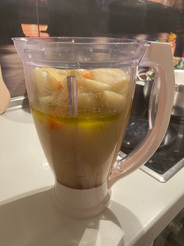 - Όταν είναι πλέον έτοιμα-δοκιμάζεις με ένα πιρούνι- αποσύρεις από τη φωτιά και ήρθε η στιγμή της πολτοποίησης. Είτε χρησιμοποιείς ραβδομπλέντερ είτε βάζεις τα υλικά στο μπλέντερ και πολτοποιείς μέχρι να έχεις λεία υφή