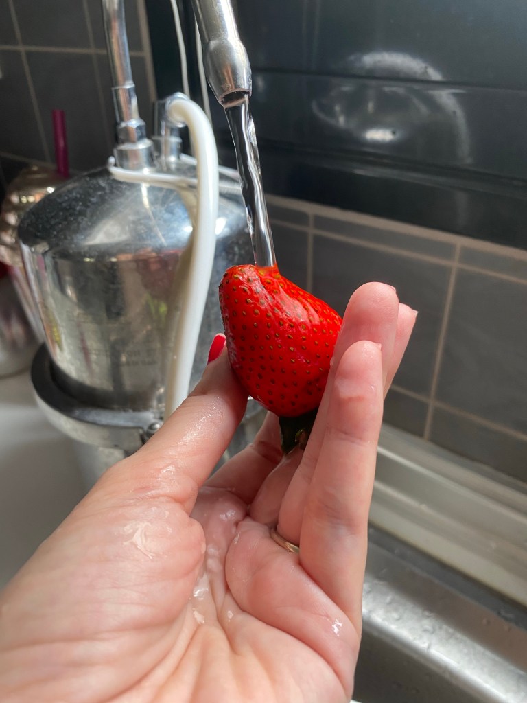 - Πλένουμε με άφθονο κρύο νερό μία μία κάθε φράουλα ώστε να διώξω ίχνη βρωμιάς/σκόνης