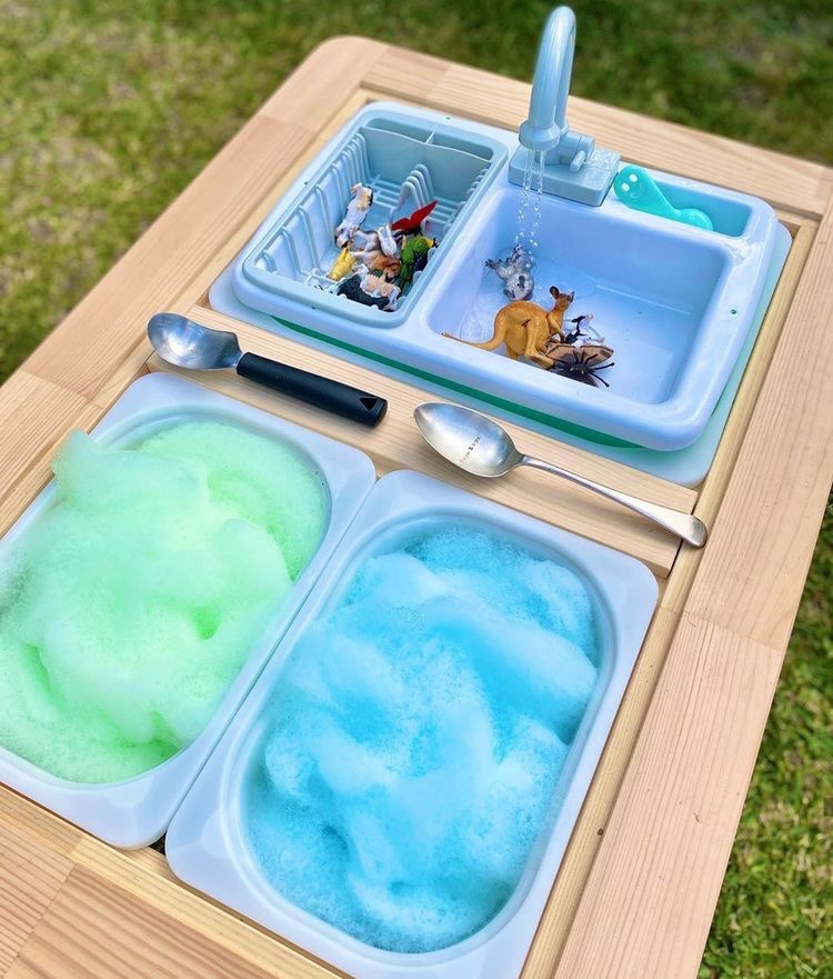 ή ό,τι άλλο εσείς θέλετε! Μπορείτε να χρησιμοποιήσετε αυτό το πολύ συμπαθητικό παιχνίδι με τον νεροχύτη από τον οποίο τρέχει πραγματικό νερό και τα μικρά «πλένουν» τα πιατάκια ή ό,τι άλλο παιχνίδι θέλουν. Ακόμα πιο απλά μπορείτε να γεμίσετε δυο κουβάδες: ο ένας με νερό και σαπουνάδα και ο άλλος με καθαρό νερό και τα αφήνετε με σφουγγαράκια να τα κάνουν όλα λαμπίκο 😅😉