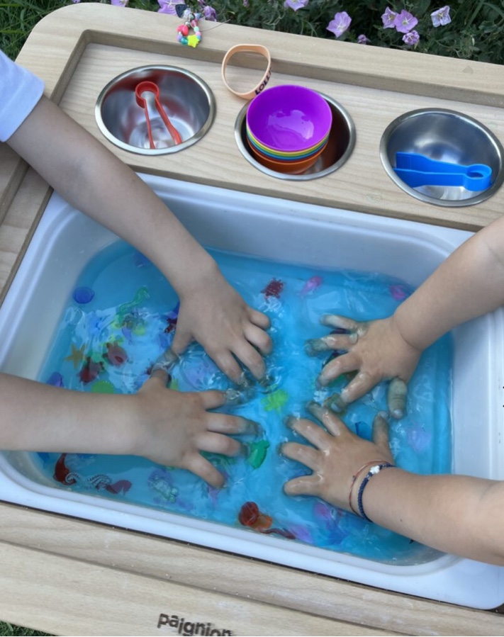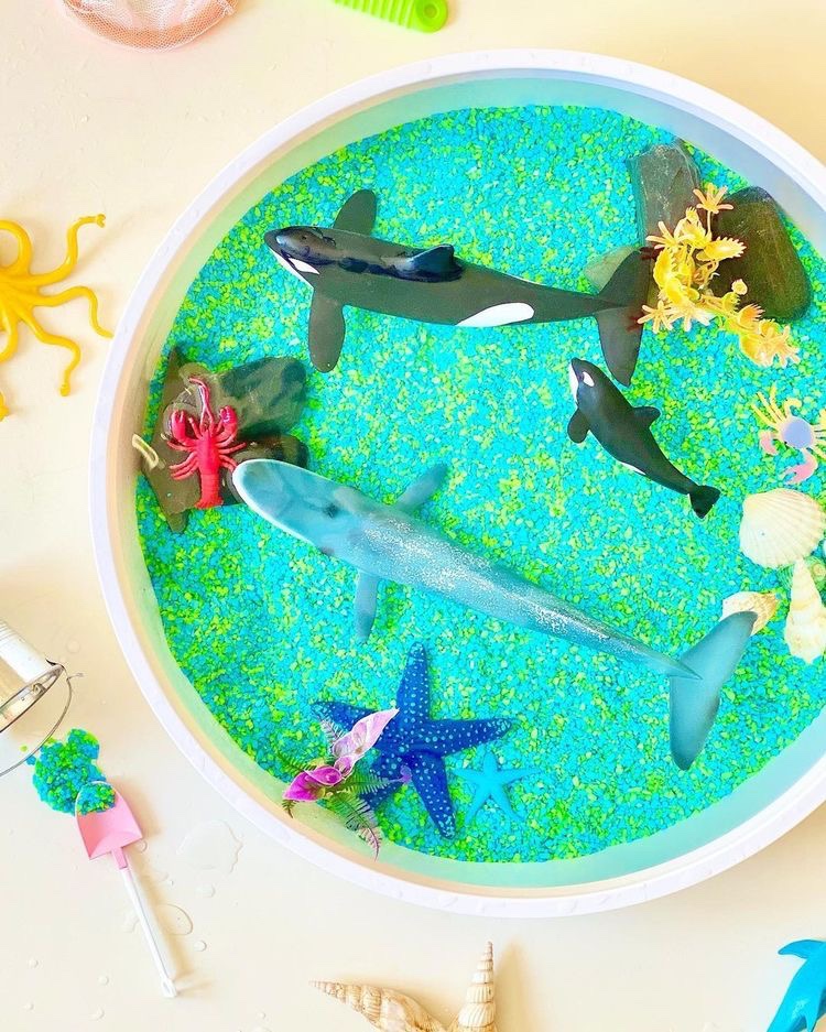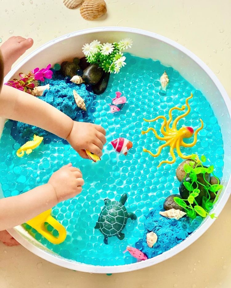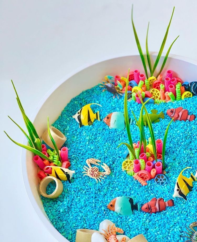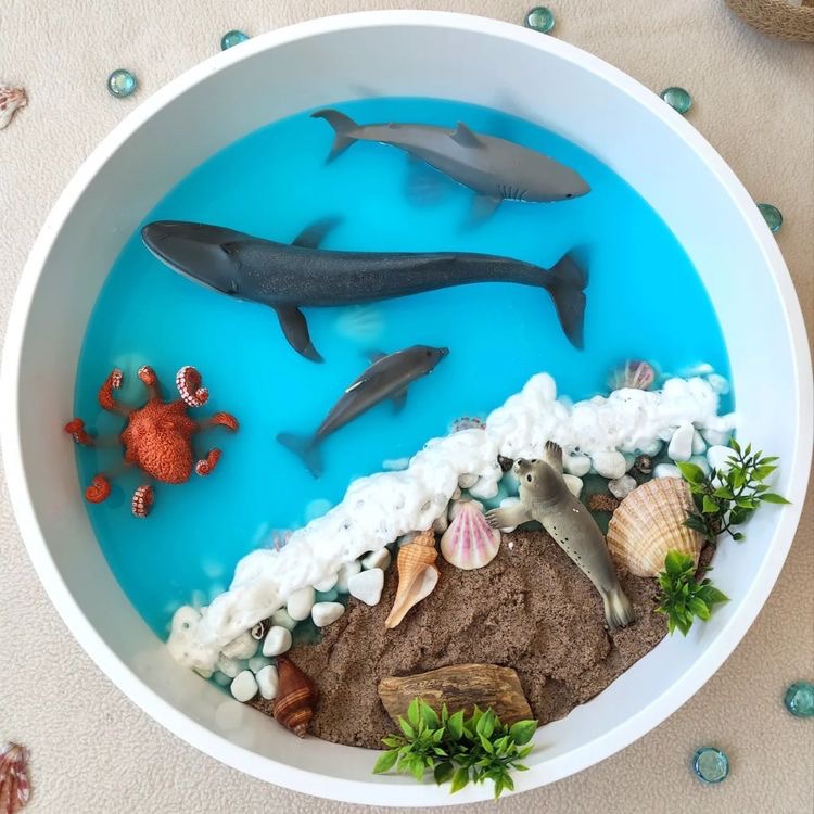 Για τα καλοκαιρινά sensory bins, το θαλασσινό στοιχείο έχει την τιμητική του όποτε ό,το έχετε σε ψαράκια, καρχαρίες, καβουράκια, πετρούλες, κοχύλια κλπ Επιστρατεύστε το 😎 Επίσης, μπλε χρώμα ζαχαροπλαστικής θα σας φανεί ιδιαίτερα χρήσιμο για να χρωματίσετε το νερό ή το ρύζι και είναι τέλειες και οι διαφανές πέρλες νερού 🫧